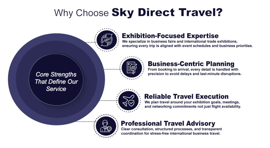 If you are attending an international trade fair, Sky Direct Travel is a dependable partner for complete travel management.