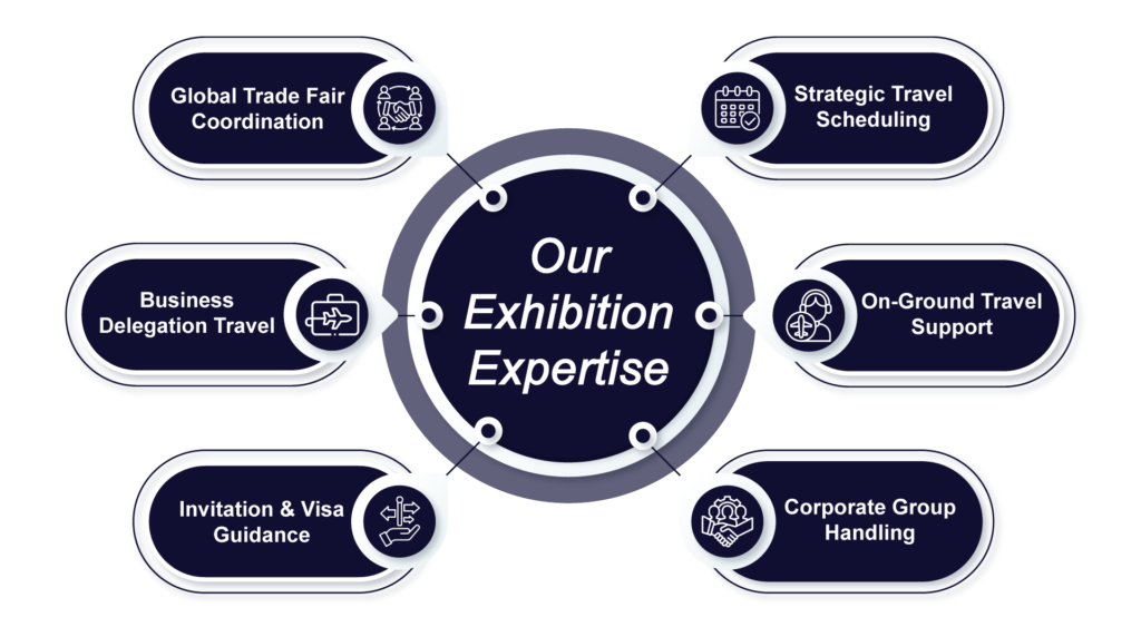 We provide international exhibition travel planning, corporate travel management, business visa assistance, flight booking, hotel booking, and end-to-end documentation support.